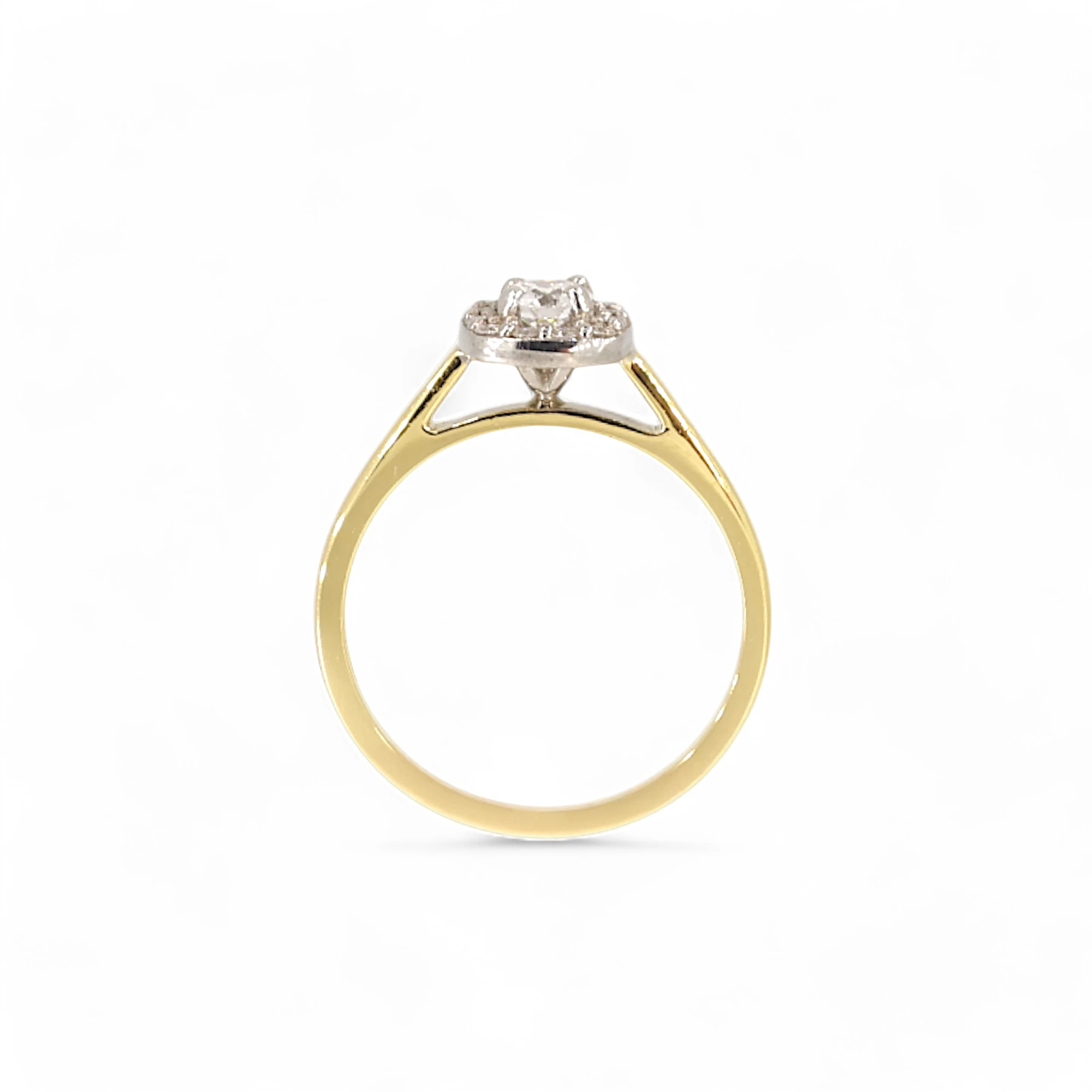 A Striking 18ct Yellow Gold diamond ring. The primary stone is a 0.25ct Brilliant cut Diamond approximately 4mm in size. All diamonds have a colour grade of F-G and a clarity grade of VS. The halo stones are 0.12ct for a combined weight of 0.37ct