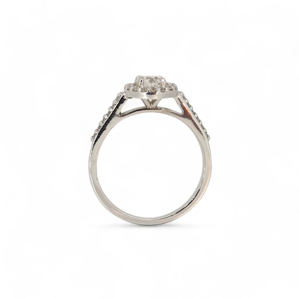 A Fabulous Platinum ring, The primary stone is a 0.26 ct Brilliant cut Diamond approximately 4mm in size. All diamonds have a colour grade of F-G and a clarity grade of VS. The halo stones are 0.22ct for a combined weight of 0.48ct