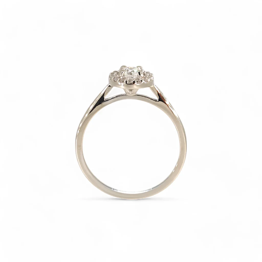 An Exquisite 18ct White Gold ring. The primary stone is a certified 0.26ct brilliant round cut Diamond approximately 4mm in size. With a grade of VS2 and G colour. The halo stones are 0.16ct for a combined weight of 0.42ct