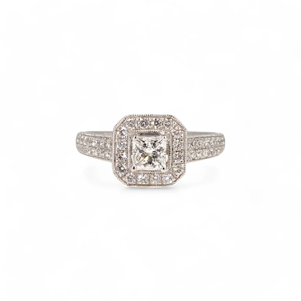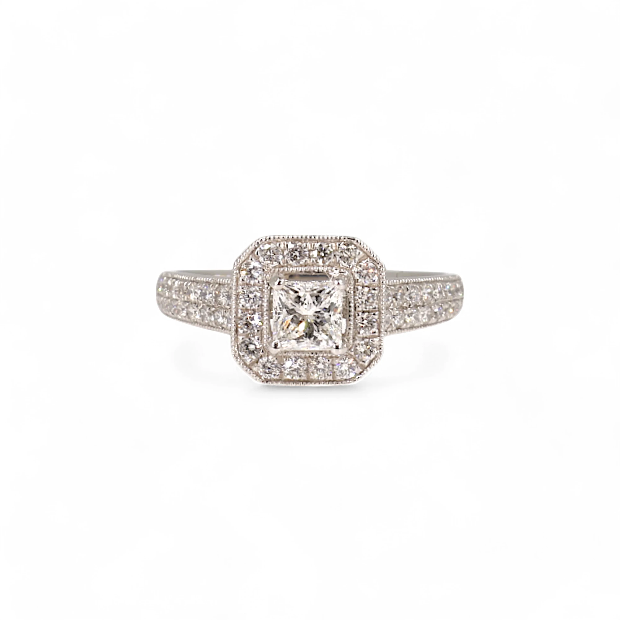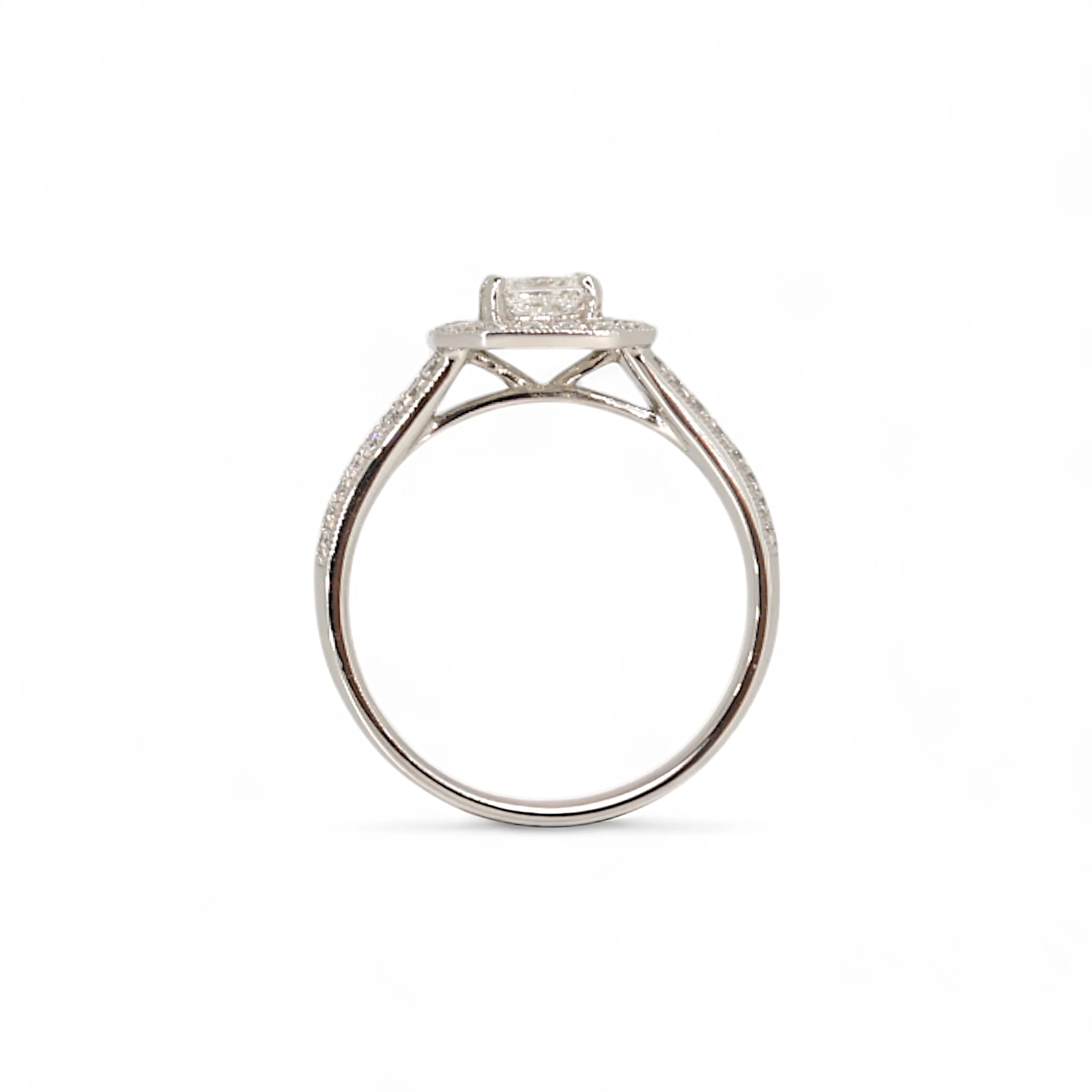 A Captivating Platinum ring, The primary stone is a GIA certified 0.40 ct Princess cut Diamond approximately 4mm in size. With a grade of VS2 and F colour. The halo stones are 0.50ct for a combined weight of 0.90ct