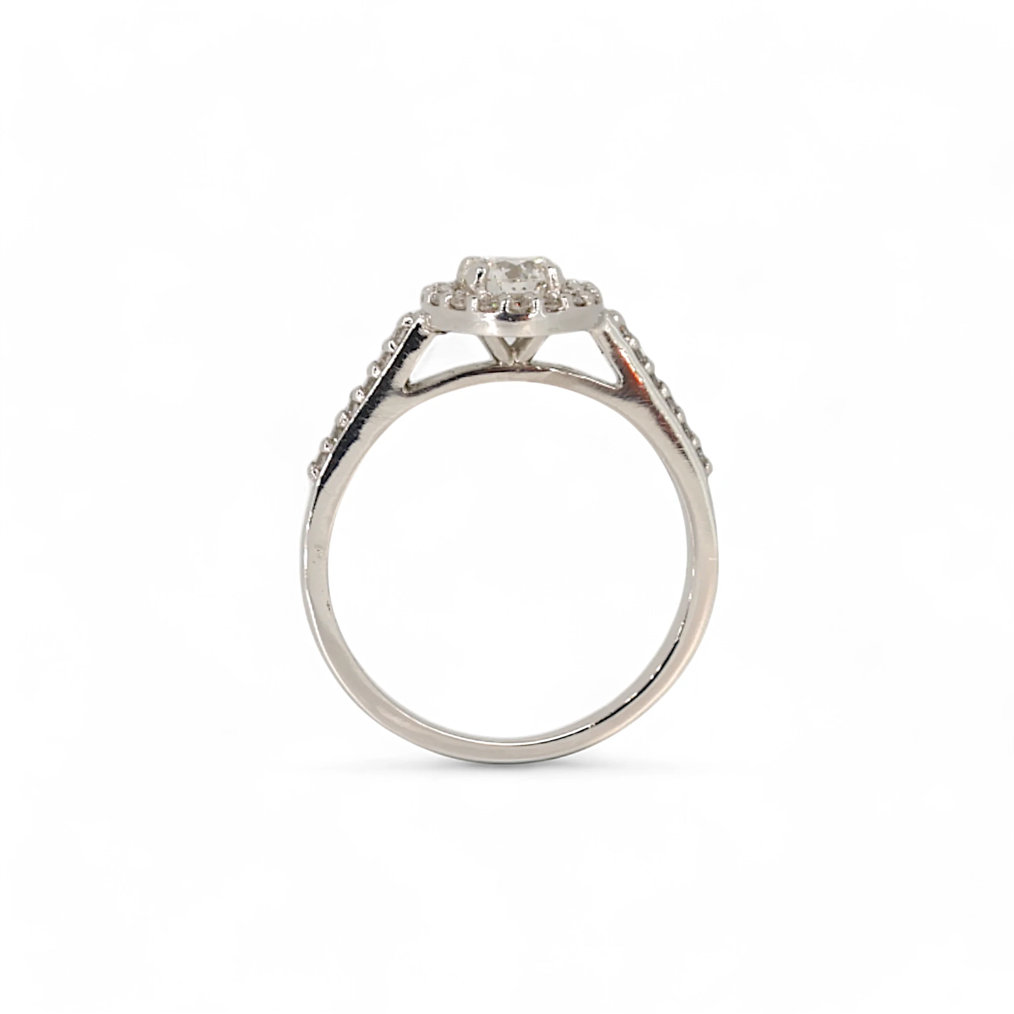 An Excellent 18ct White Gold ring, The primary stone is a GIA certified 0.50ct Brilliant cut Diamond approximately 4.80mm in size. With a grade of SI1 and F colour. The halo stones are 0.28ct for a combined weight of 0.82ct