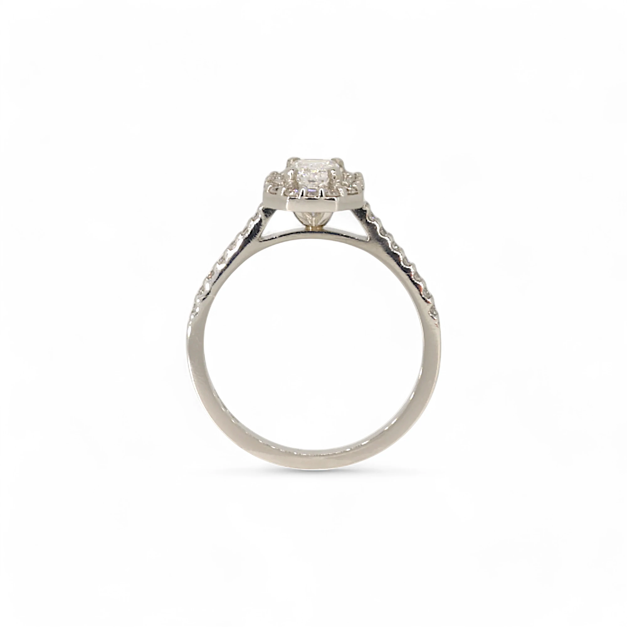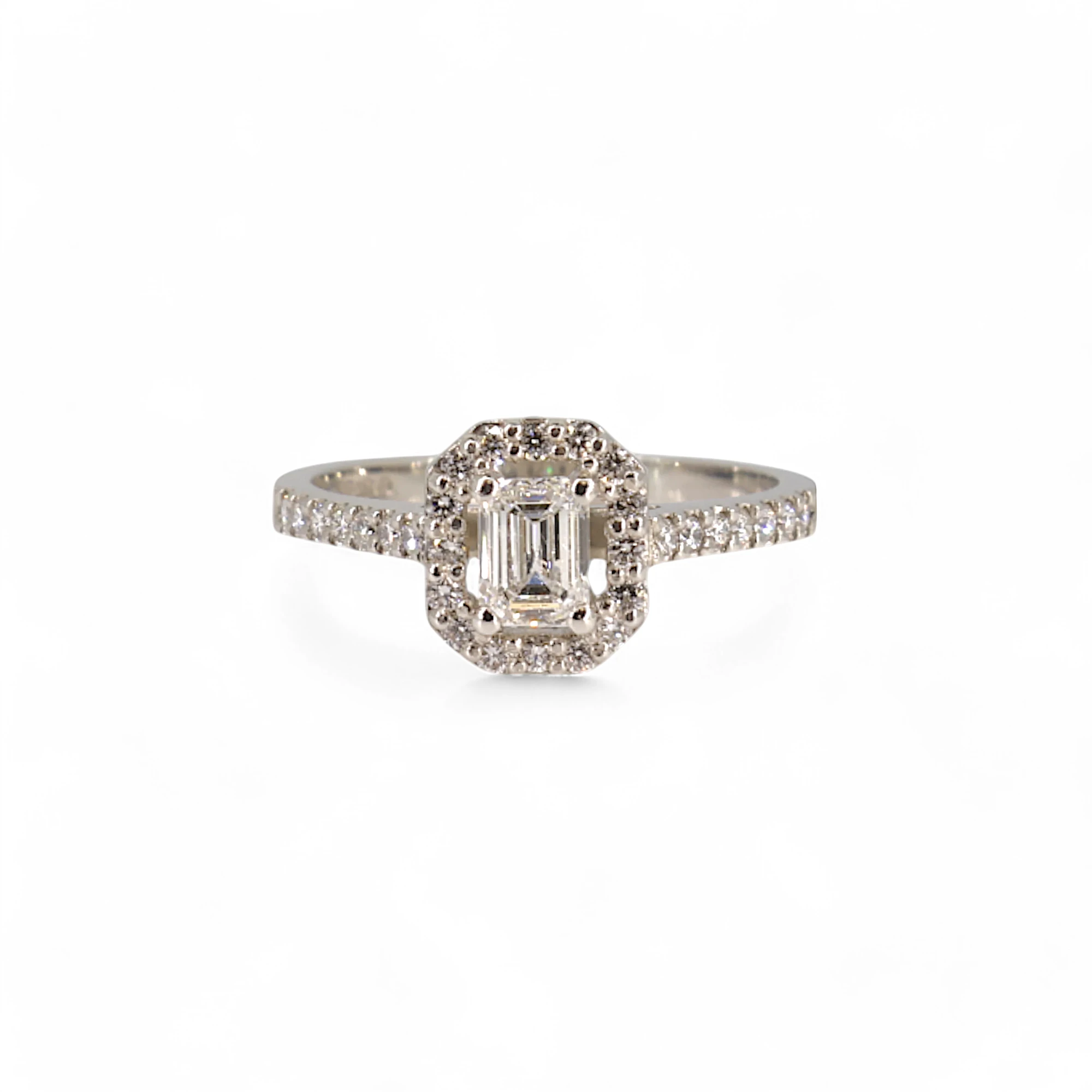 An Outstanding Platinum ring, The primary stone is a GIA certified 0.52 ct Emerald cut Diamond approximately 6x3mm in size. With a grade of VS2 and F colour. The halo stones are 0.32ct for a combined weight of 0.84ct