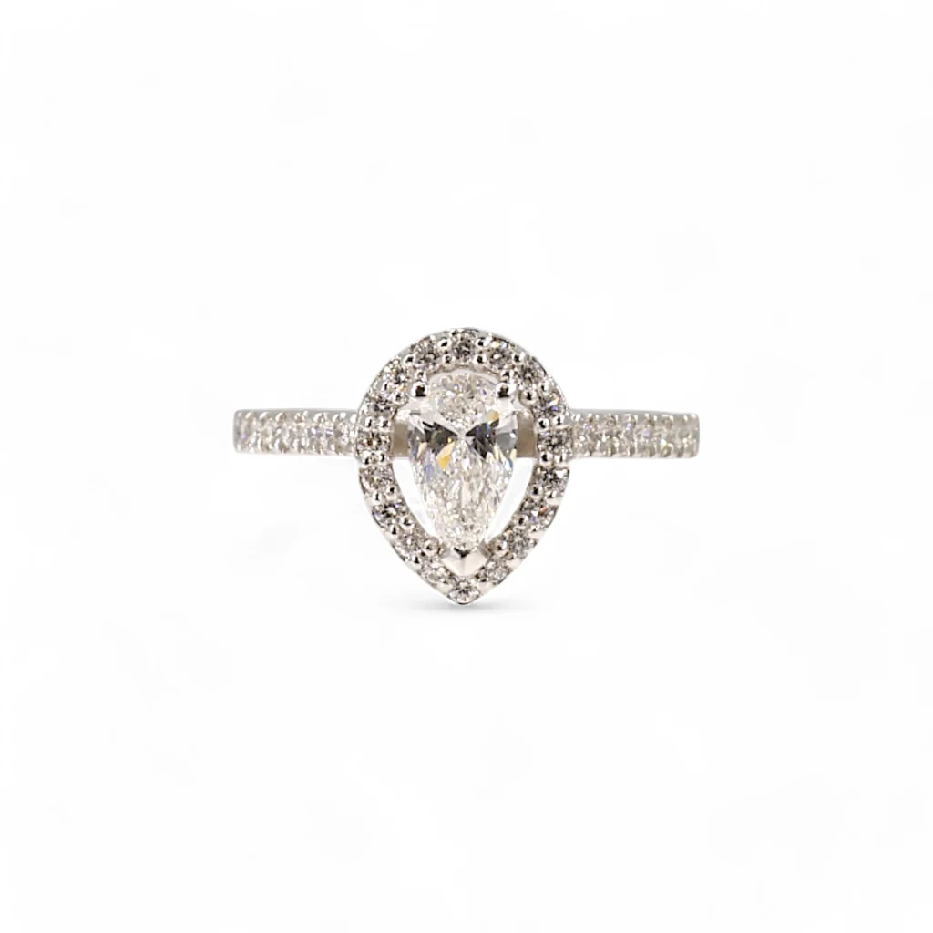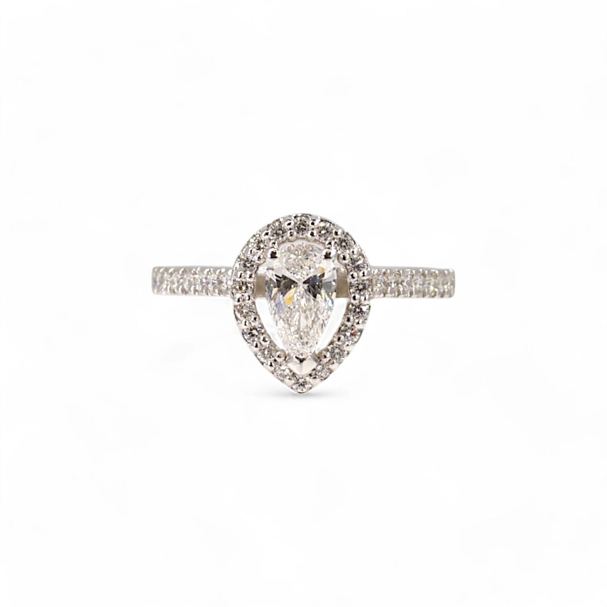 A Beautiful Platinum ring, The primary stone is a IGI certified 0.50 ct Brilliant cut Diamond approximately 5mm in size. With a grade of VS1 and E colour. The halo stones are 0.32ct for a combined weight of 0.82ct