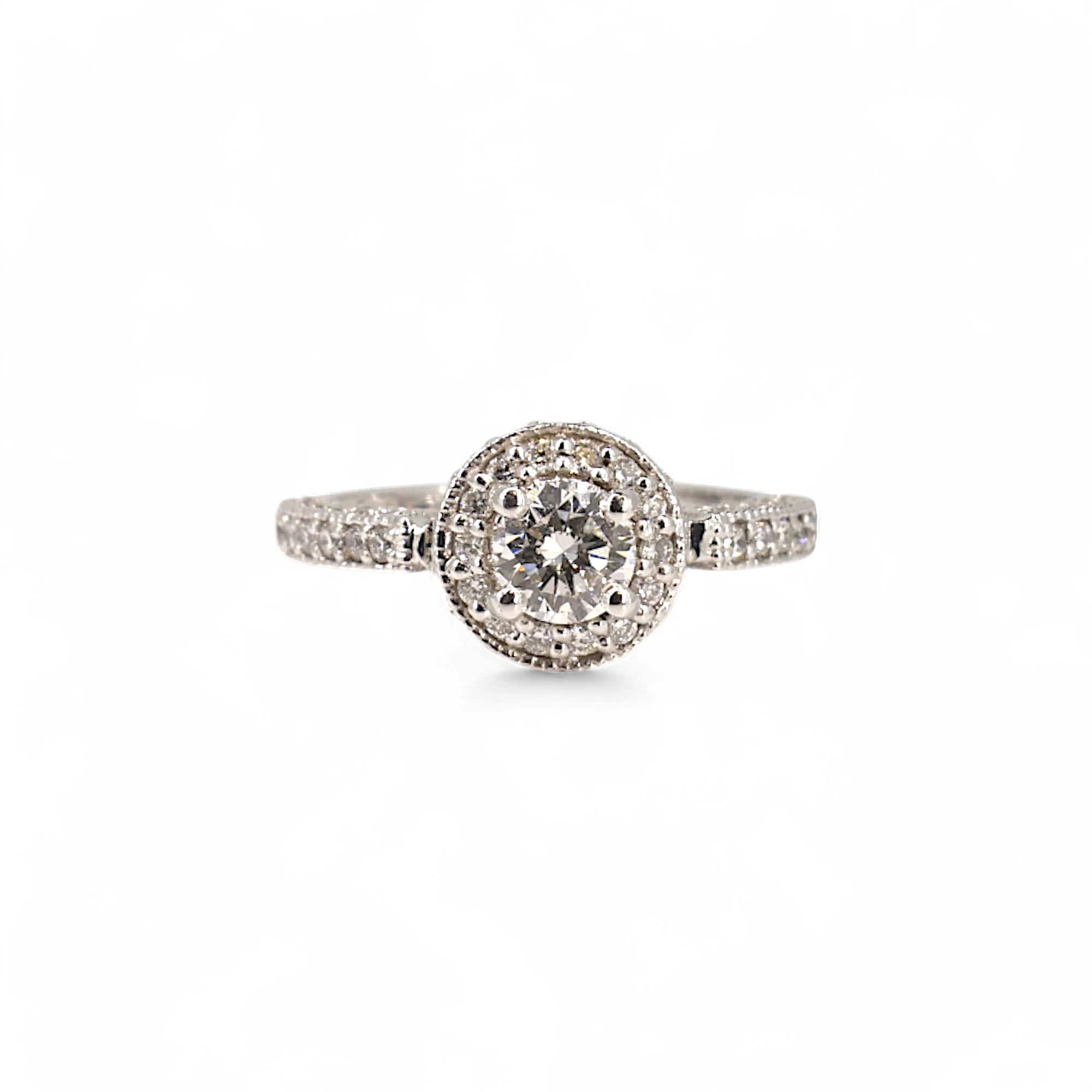 An Exquisite Platinum ring, The primary stone is a GIA certified 0.50 ct Princess cut Diamond approximately 4.40mm in size. With a grade of VS2 and F colour. The halo stones are 0.28ct for a combined weight of 0.78ct