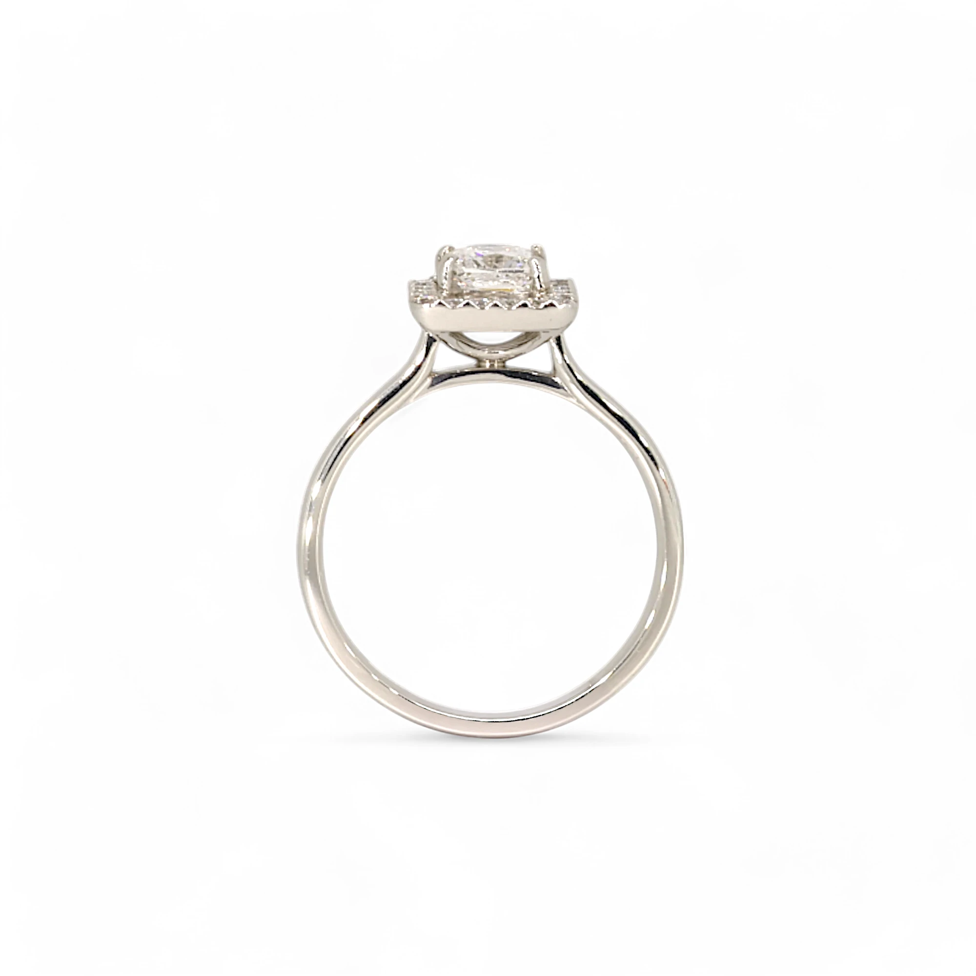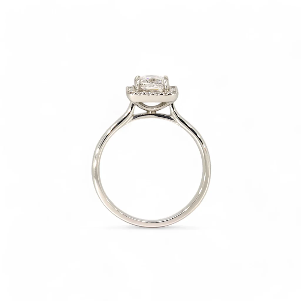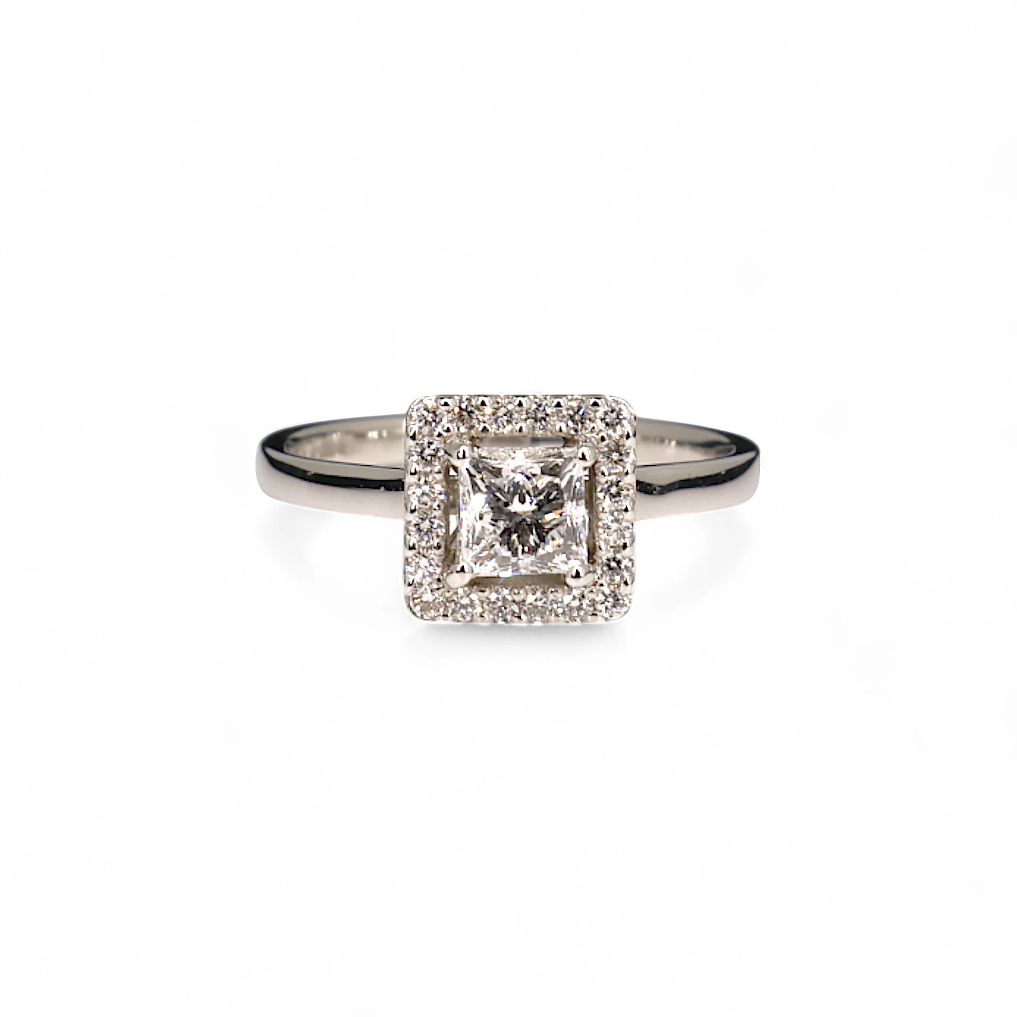 A Magnificent Platinum ring, The primary stone is a 0.71 ct Princess cut Diamond approximately 4.80mm in size. With a grade of VS1 and E colour. The halo stones are 0.20ct for a combined weight of 0.91ct