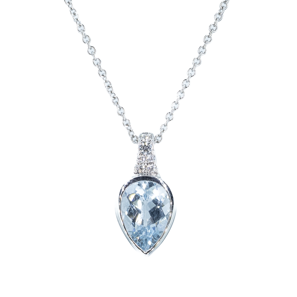 This beautiful aquamarine pendant has an 18 inch white gold chain which is 18ct gold. This chain holds a beautiful aquamarine in a rim set design with a diamond set bale the total diamond weight is 0.10ct. These diamonds have a F-G colour grade and a VSI clarity grade. The total aquamarine weighs 1.65ct