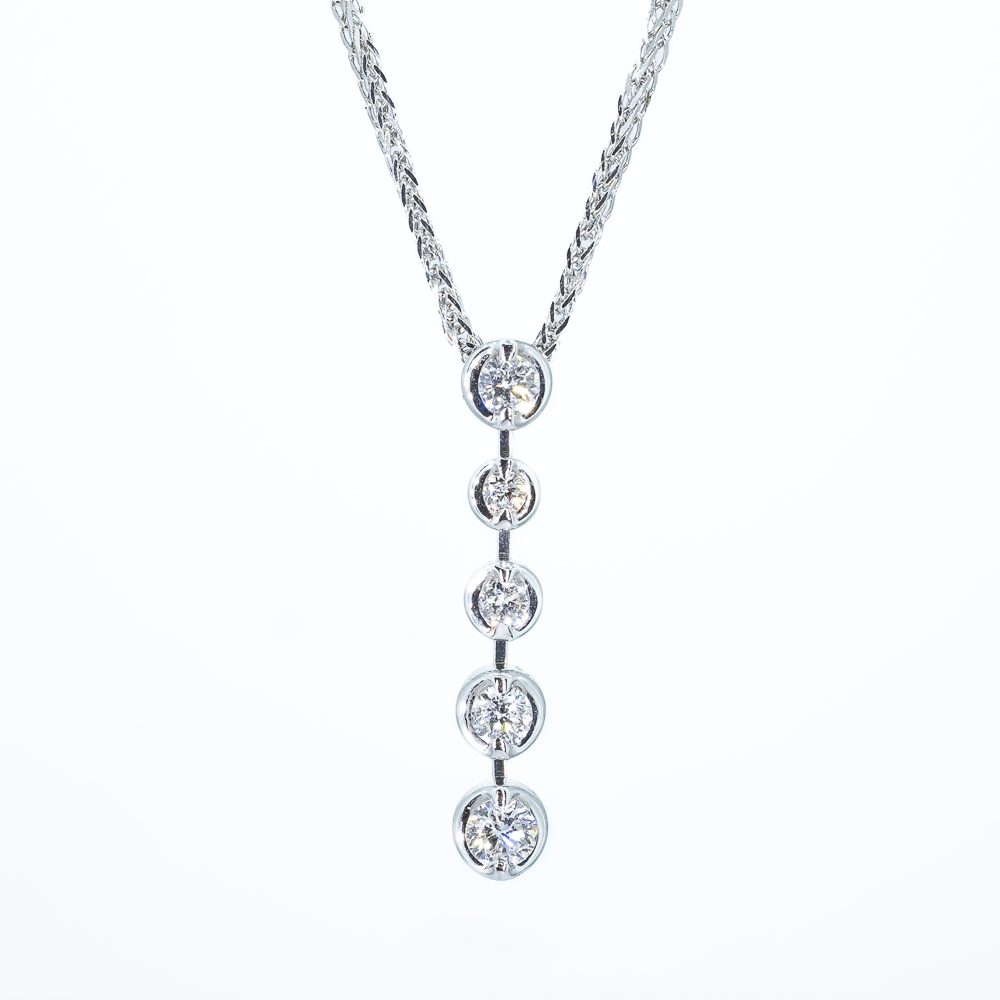 This beautiful diamond pendant has an 18 inch white gold chain which is 18ct gold. This chain holds 0.33ct total weight of diamonds. This diamond is a F-G colour grade and a VSI clarity grade. This come with a 18” chain.