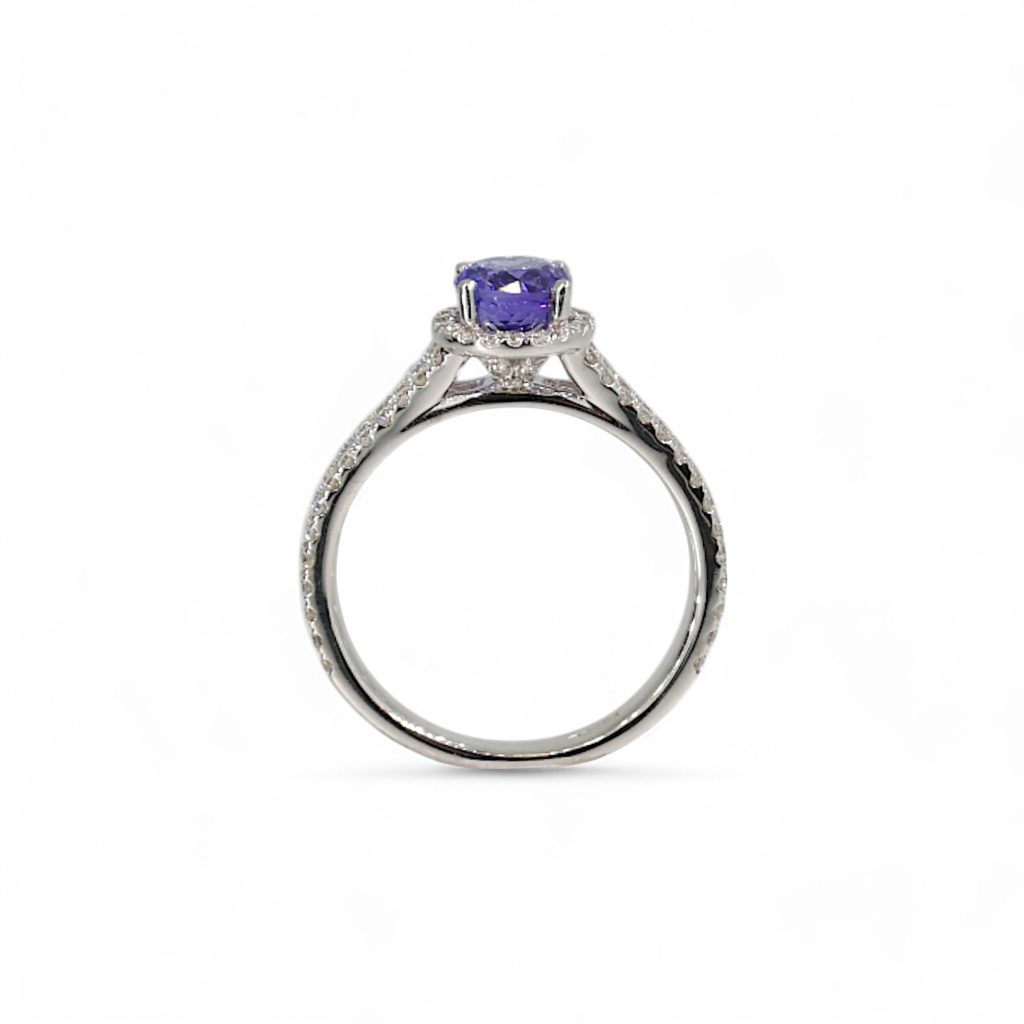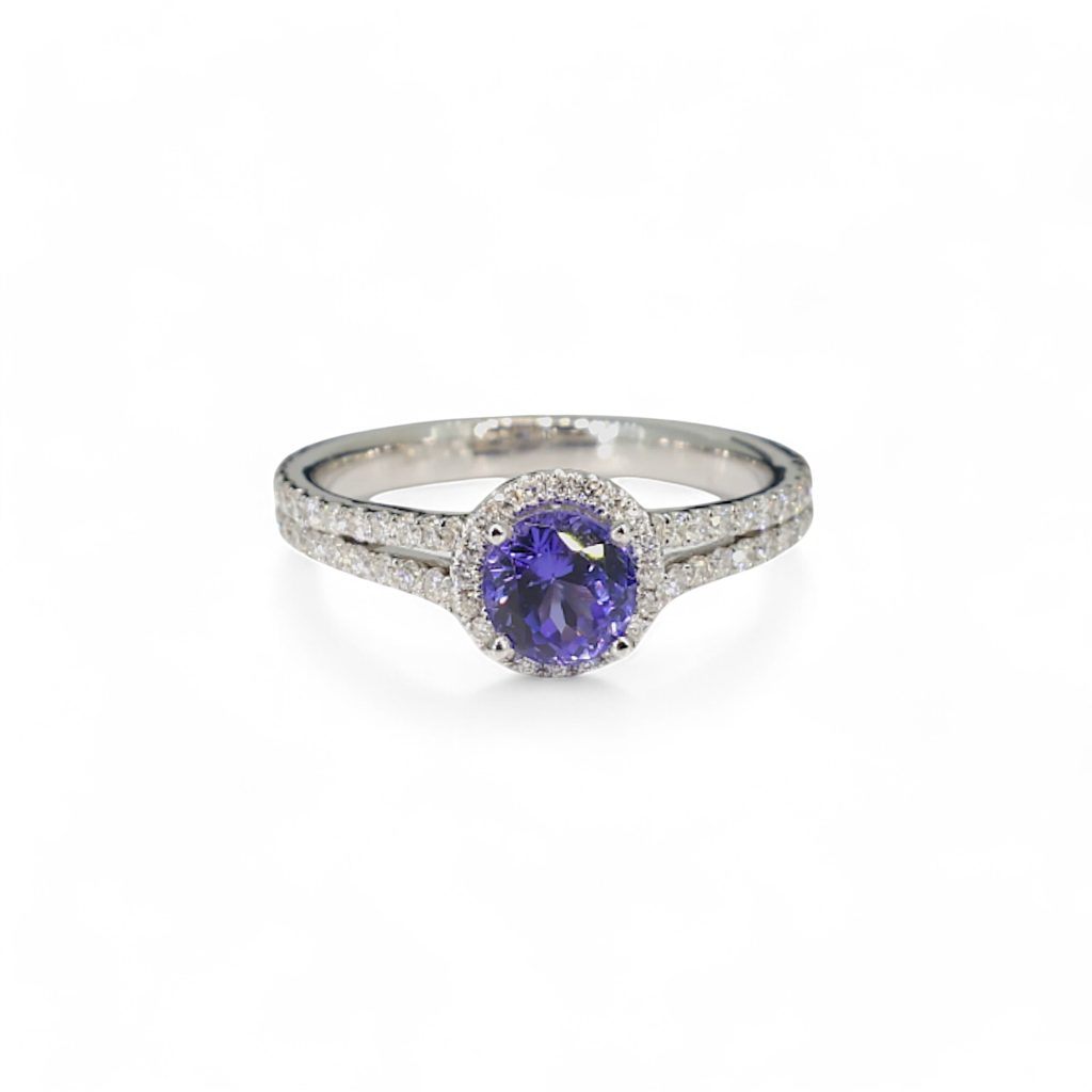 18ct white gold tanzanite and diamond ring. Tanzanite total weight 0.90cts with AAA+ quality and a total diamond weight of 0.61cts. the diamonds colour grades are F-G and clarity grade VSI.