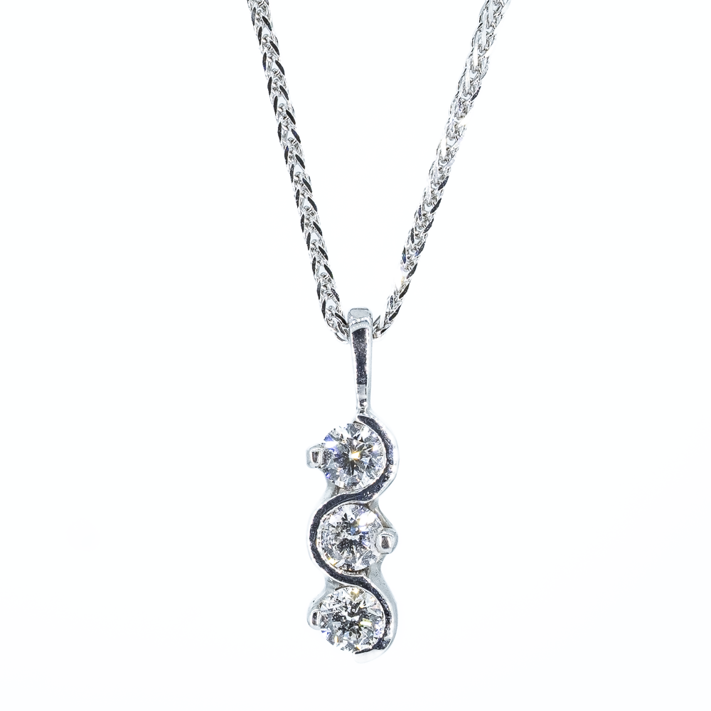 18ct white gold bar set three stone drop diamond pendant