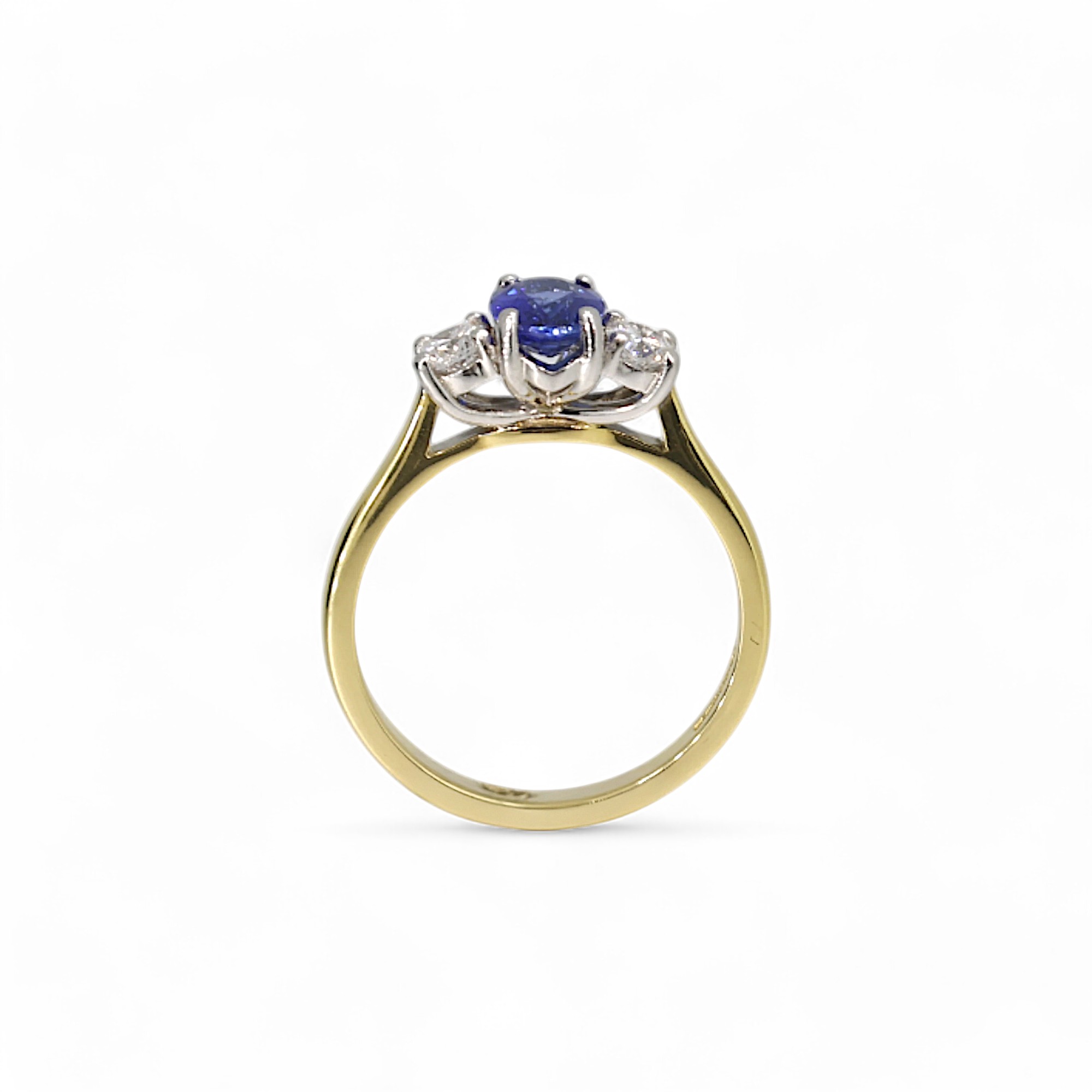 18ct yellow gold royal blue sapphire and diamond three stone ring. The royal blue sapphire’s total weight 0.70cts with AAA+ quality and the diamonds total weight is 0.24cts. With diamonds colour grade F-G and clarity grade VSI.