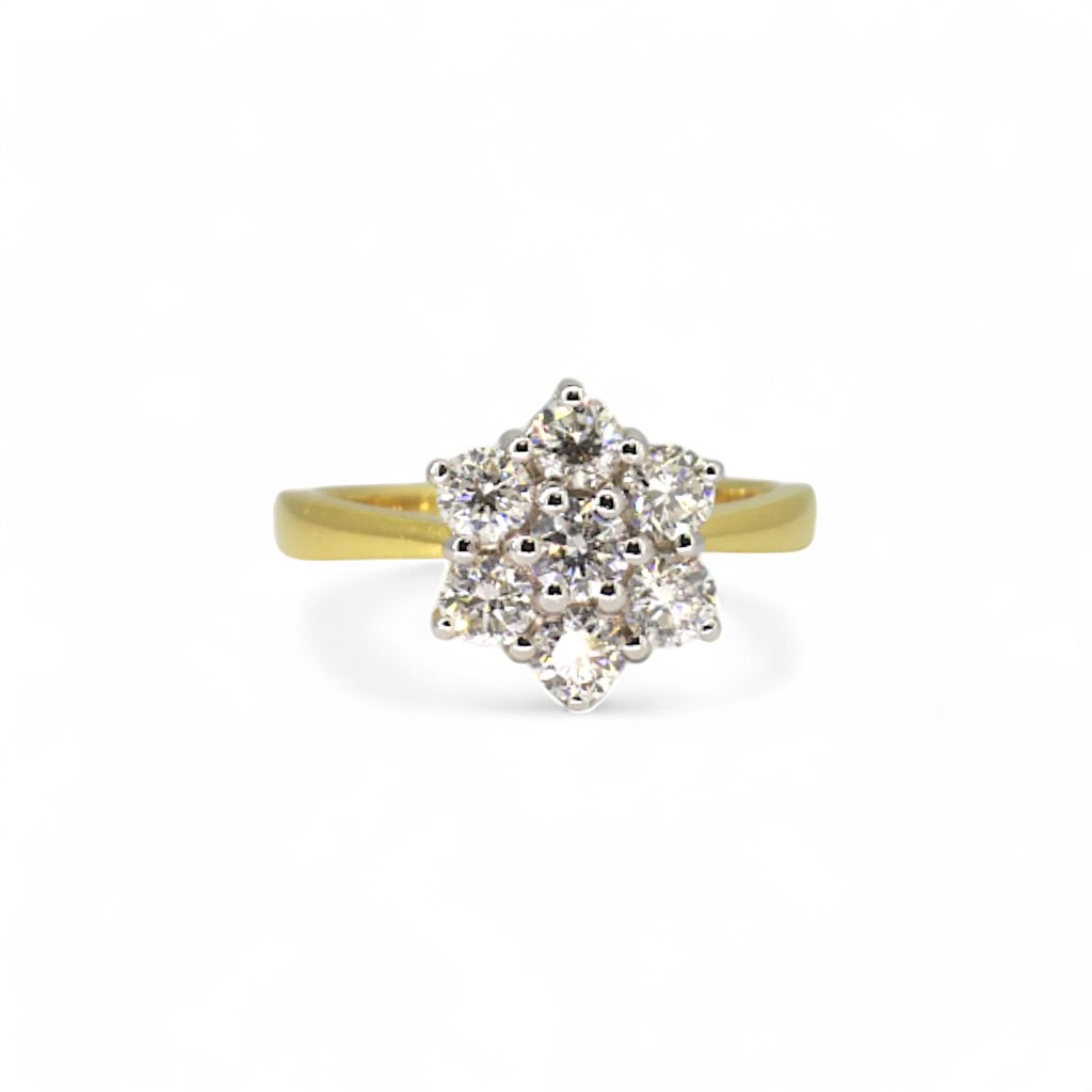 18ct yellow gold diamond cluster ring. This ring has a total diamond weight of 1.00cts and a colour grade of F-G, clarity grade VSI.