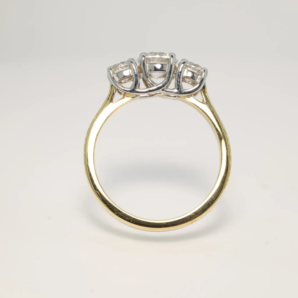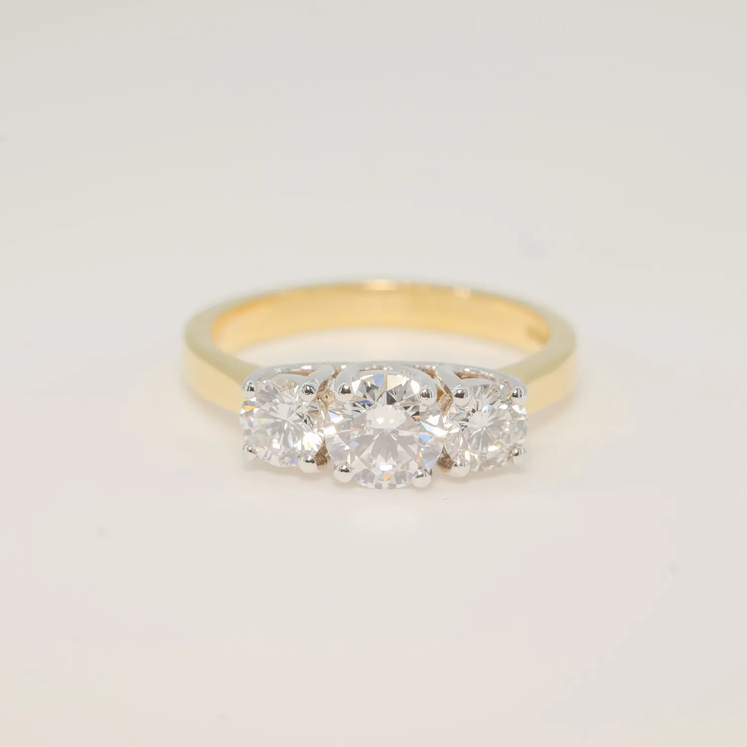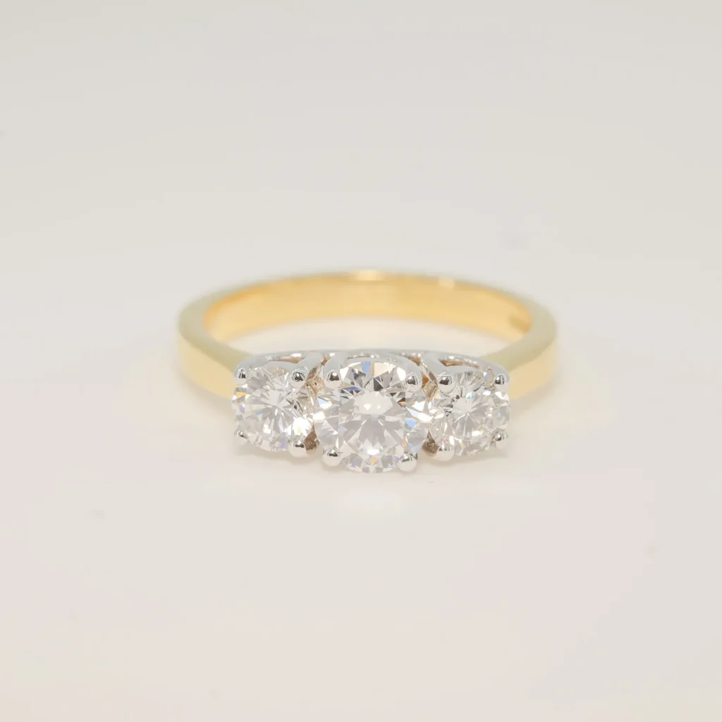 This is our breathtaking 18ct yellow gold laboratory grown diamond three stone with a total diamond weight of 1.41 carats. All the diamonds are certified with a D colour and a VS1 clarity grade.