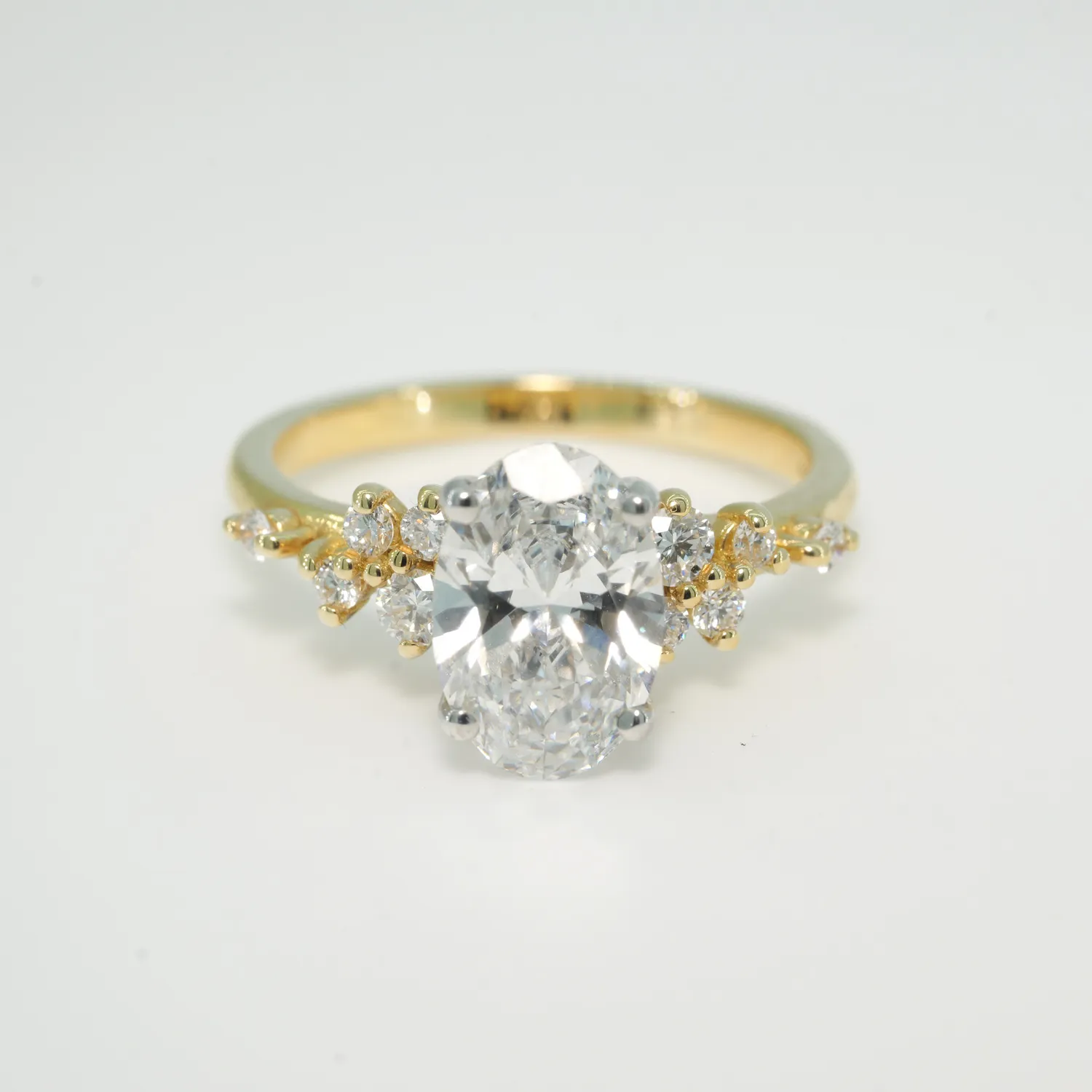18ct yellow gold exquisitely designed diamond ring. The centre diamond is laboratory grown and has a total diamond weight of 2.00cts. This stone is IGI certified with a D colour and a VS1 clarity. The scattered shoulder diamonds have a total weight of 0.30cts and are of matching qualities.