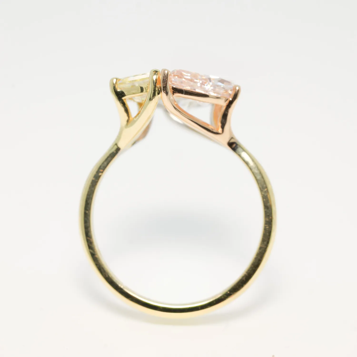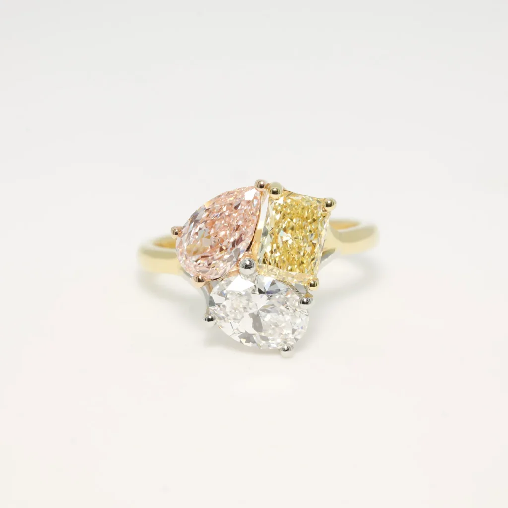 This is our multicoloured laboratory grown diamond ring specially and exquisitely crafted. The yellow diamond radiant cut has a total weight of 1.04 carats, the pink diamond pear has a total weight of 1.09 carat, the oval cut white diamond has a total weight of 1.01 carats.