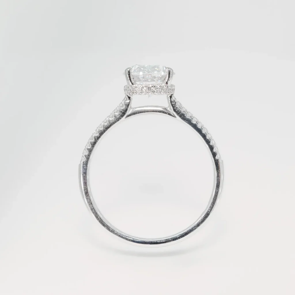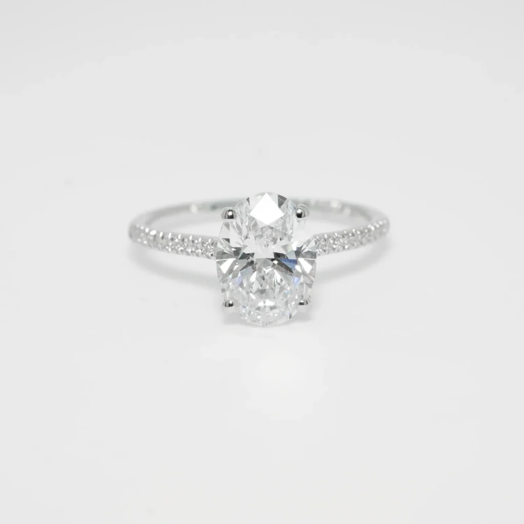 Our beautiful laboratory grown diamond shoulder set ring. This ring has an oval cut centre diamond of 2.00ct. This stone is IGI certified with a D colour and a VS2 clarity. The diamond set shoulders have a total weight of 0.17 carats and are of matching qualities.