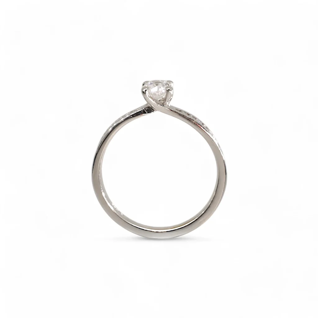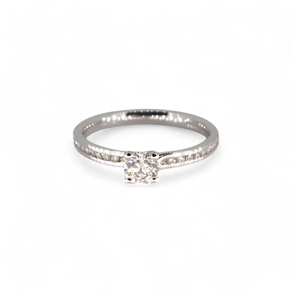 Platinum delicate twist channel set diamond ring with a GIA certified diamond centre stone total weight of 0.40cts. Diamond colour grade D , Clarity grade VS2. Diamond set shoulders 0.17cts