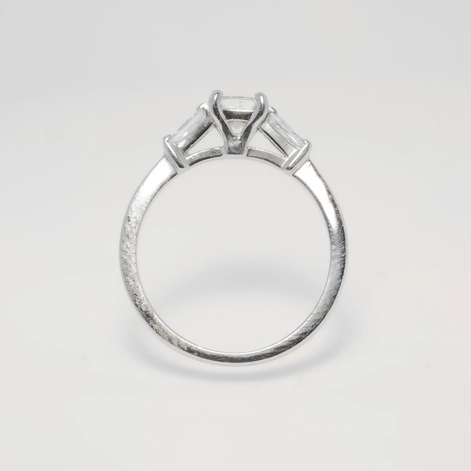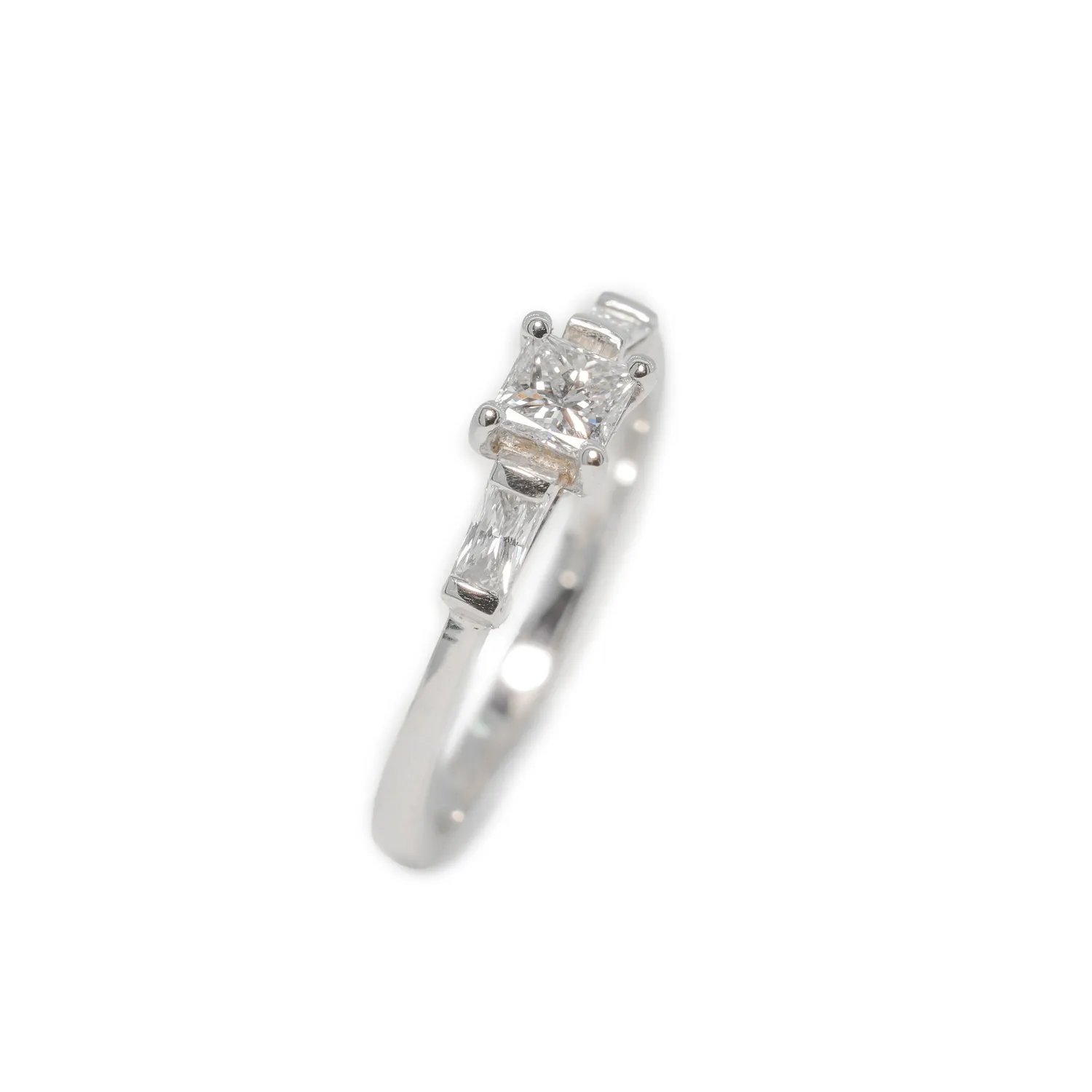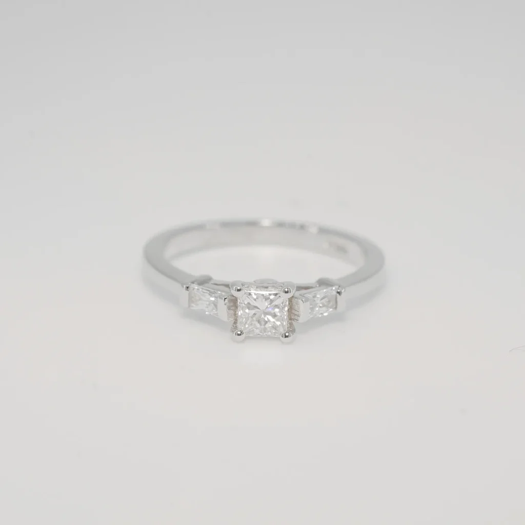 Gorgeous platinum diamond princess and princess cut baguette diamond ring. The princess cut centre stone has a total weight of 0.32 carats and is certified with a F colour and VS2 clarity. The princess cut baguettes have a total weight of 0.36 carats and are of matching qualities.