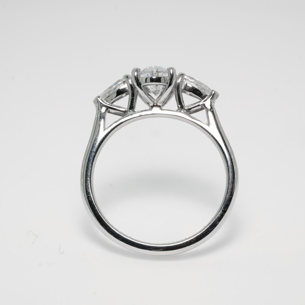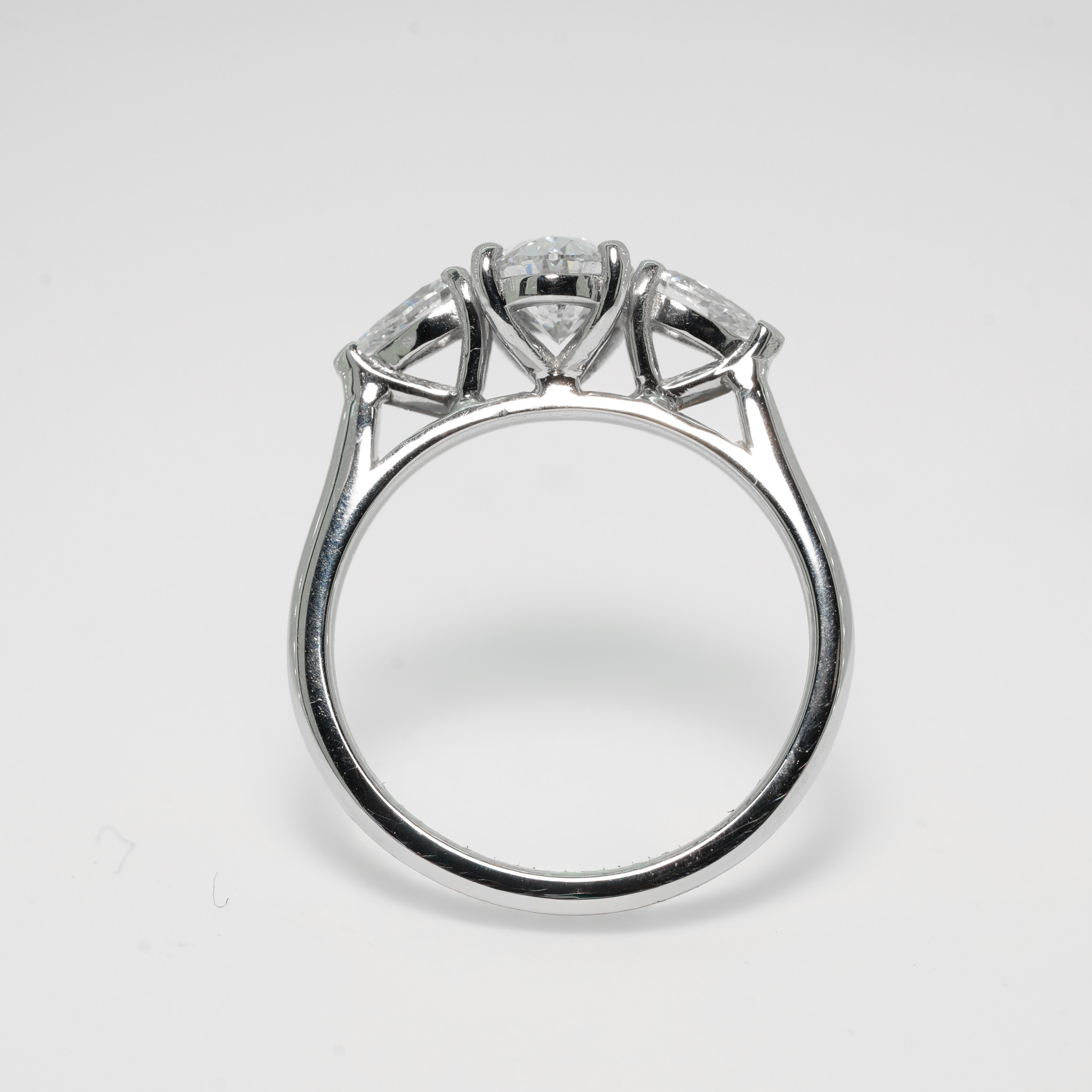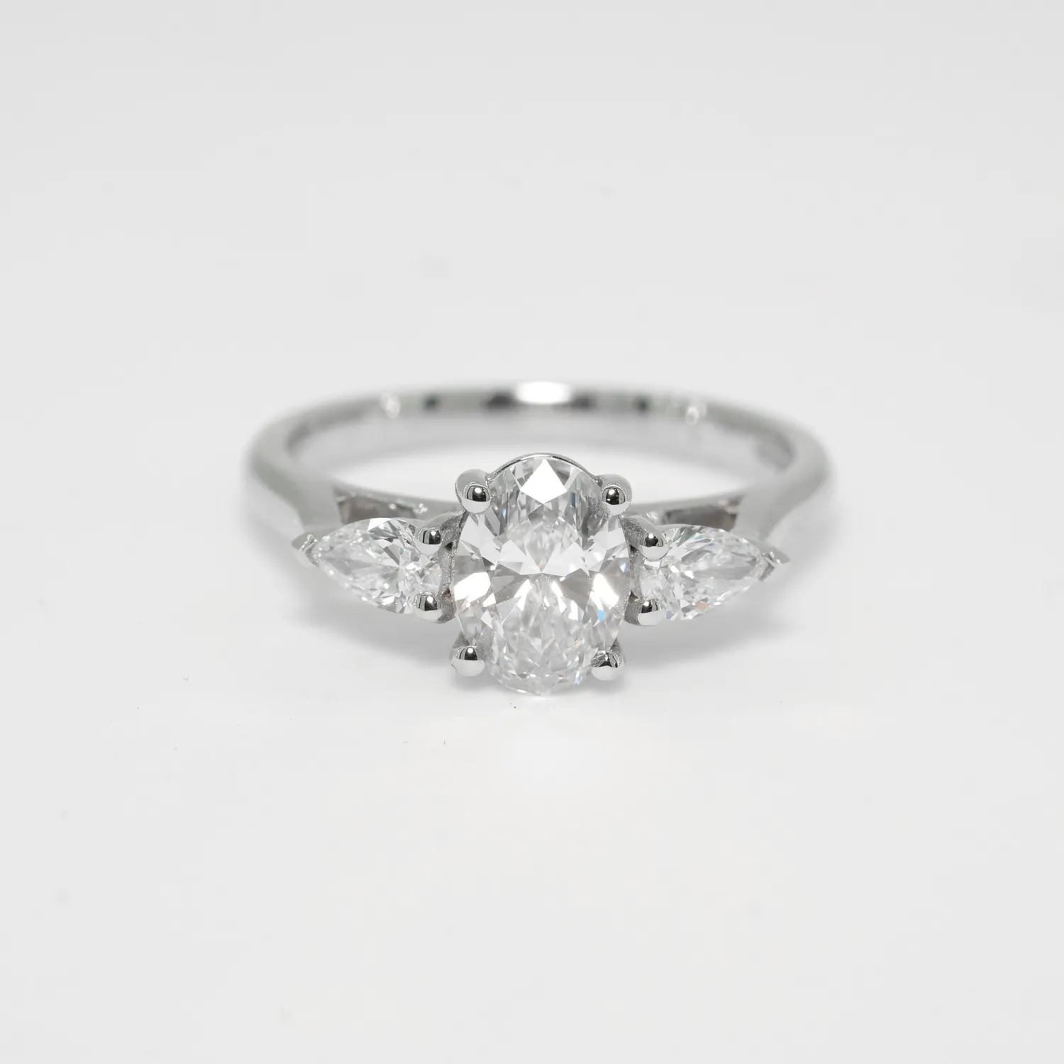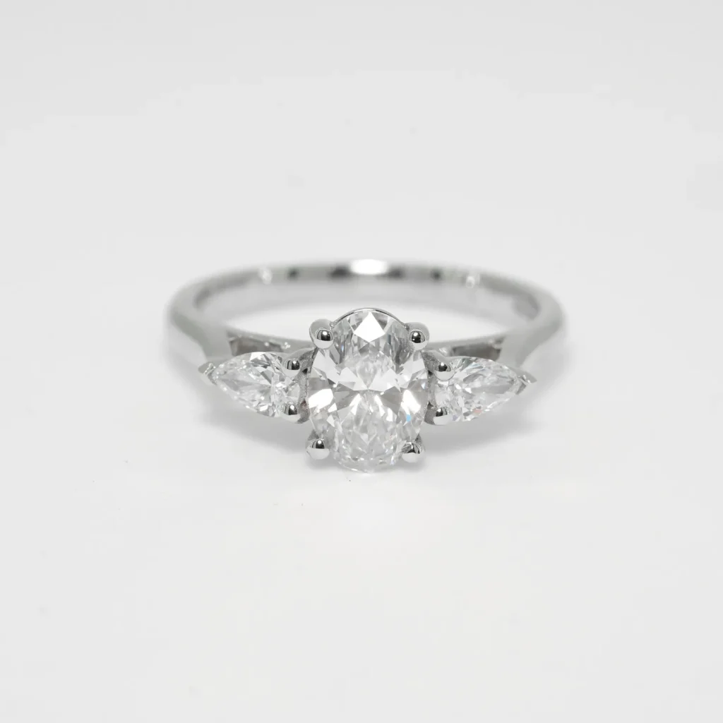 This is our beautiful laboratory grown Oval cut diamond and pear cut diamond three stone. The centre oval diamond has a total weight of 0.01 carats. This stone is IGI certified with a D colour and a VS2 clarity. The outer pears have an inclusive diamond weight of 0.70 carats. These stones are of matching qualities.