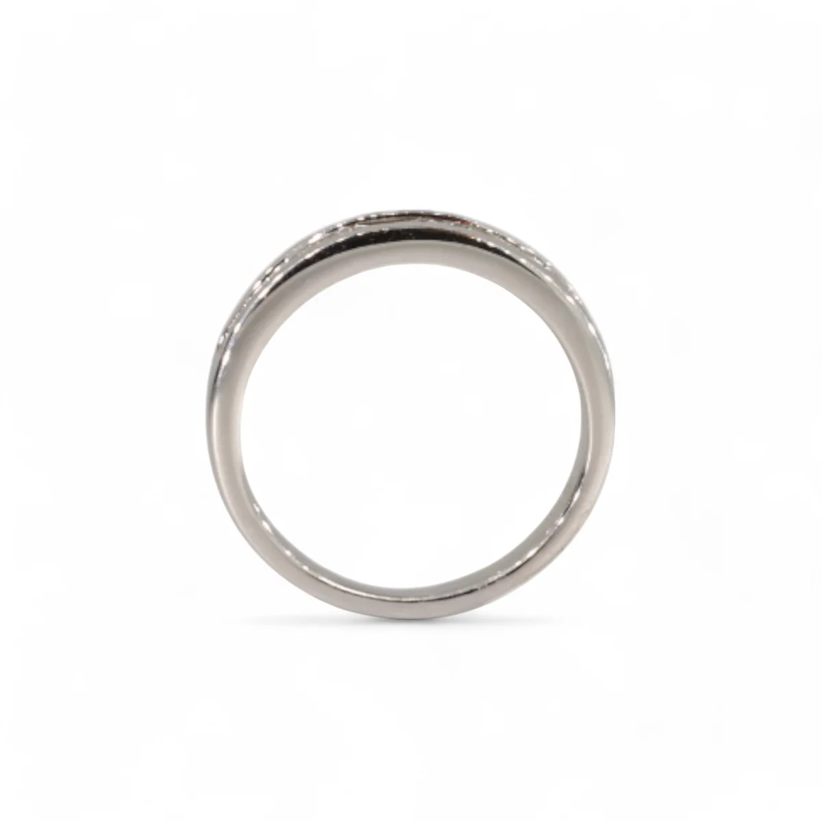 Platinum channel set diamond band with brilliant round and princess cut diamonds. Inclusive diamond weight of 0.32ct. The diamonds colour grades are F-G and the clarity grade VSI.