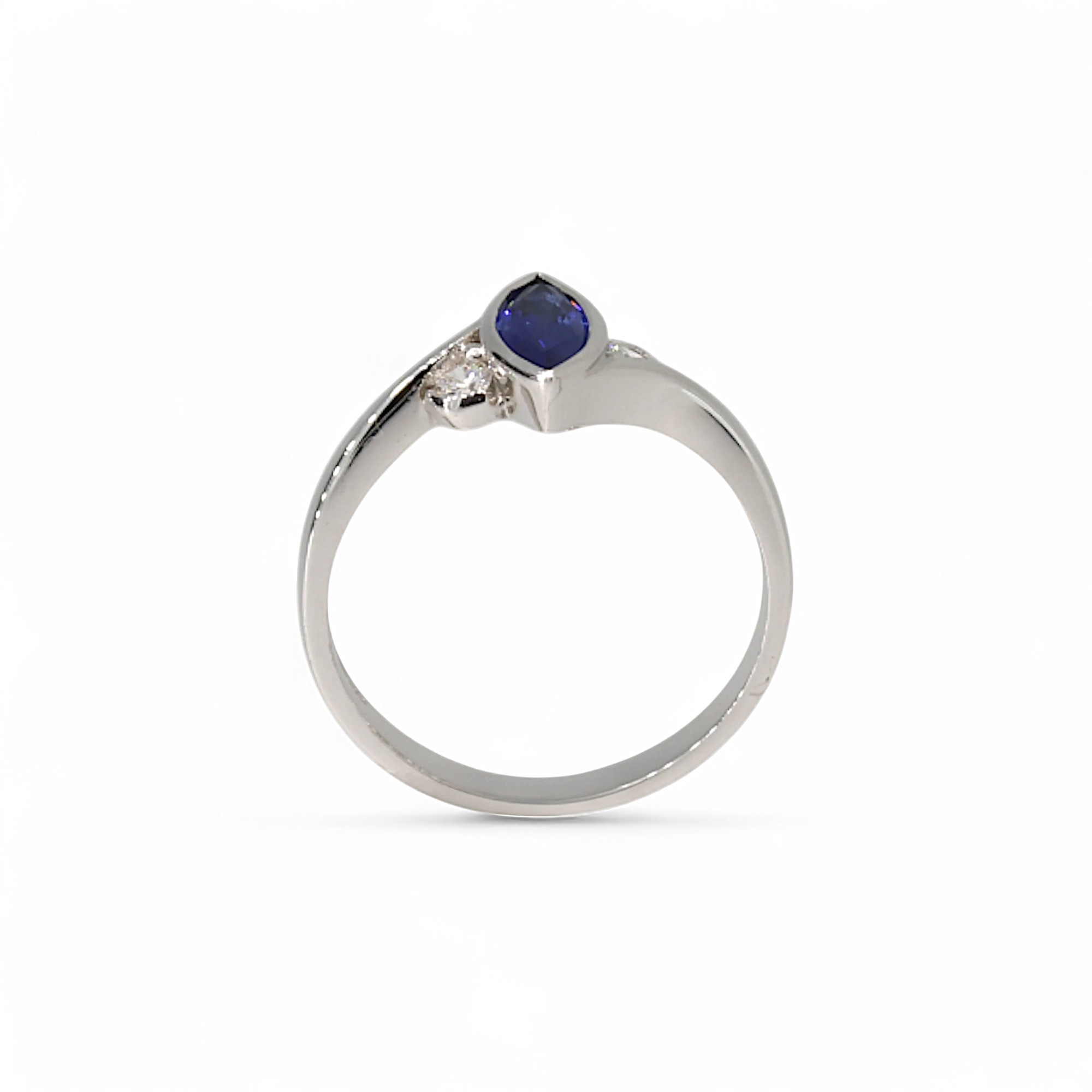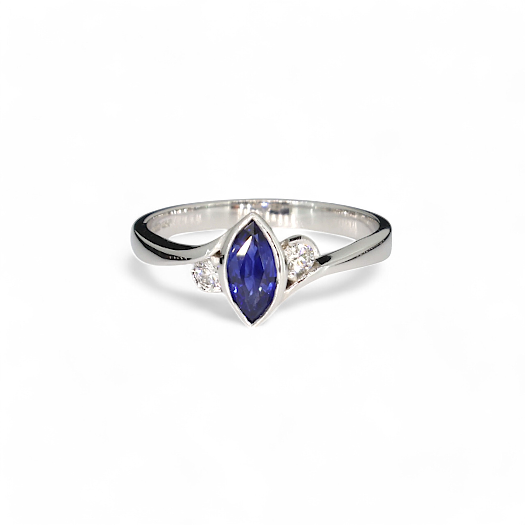Platinum rub over marquise cut royal blue sapphire and diamond ring. The royal blue sapphire’s total weight 0.56cts with AAA+ quality and the diamonds total weight is 0.12cts. With diamonds colour grade F-G and clarity grade VSI.